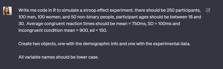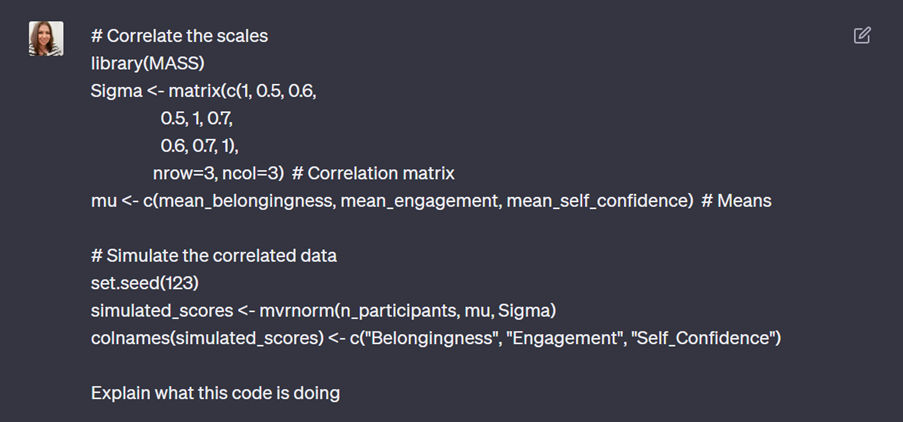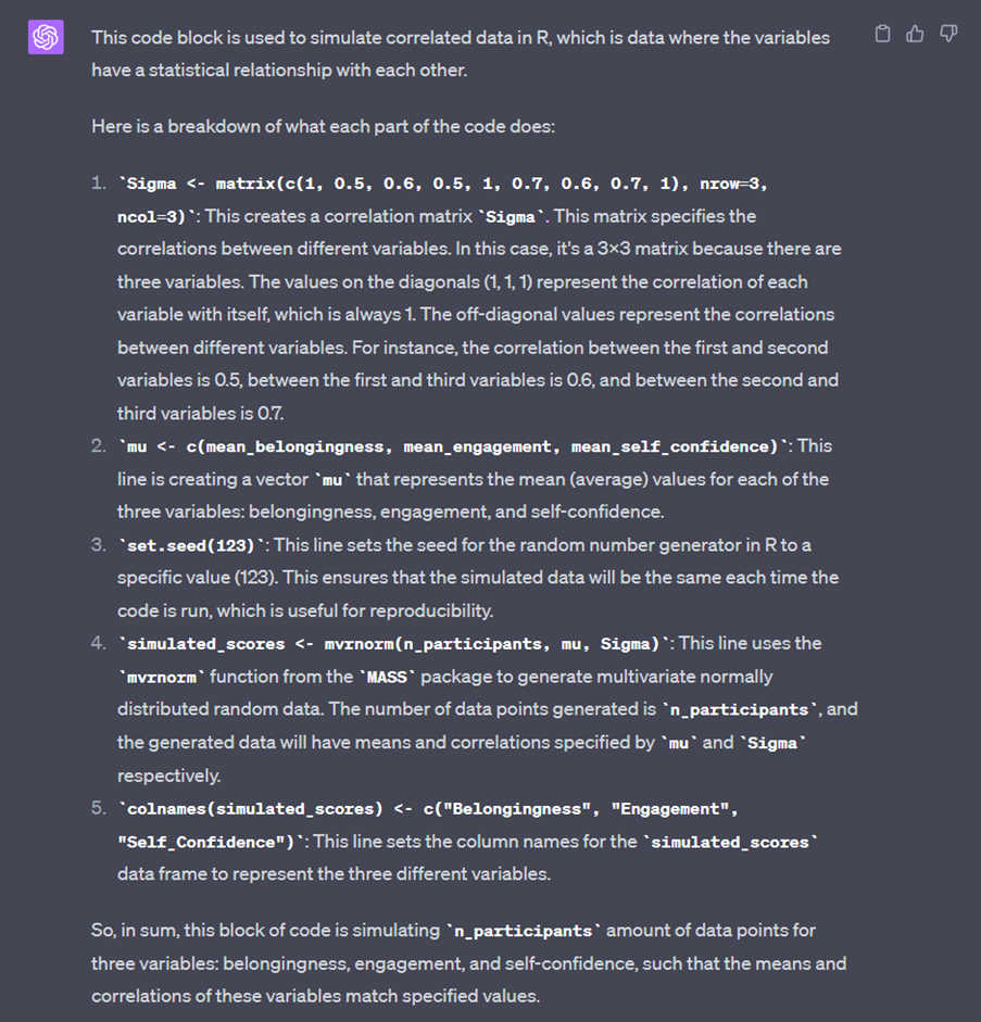 In the case of data simulation, using ChatGPT has given me the opportunity to pick the best possible dataset for what I’m trying to teach, rather than being constrained by the time it would take to find or simulate it myself. I’ve also used it to teach myself more about how to perform data simulation in R. For the most part, I’ve understood the code it has produced, it’s just not been quite familiar enough to me to do it off the top of my head, but there have been a couple of times where it’s given me something I haven’t done before.