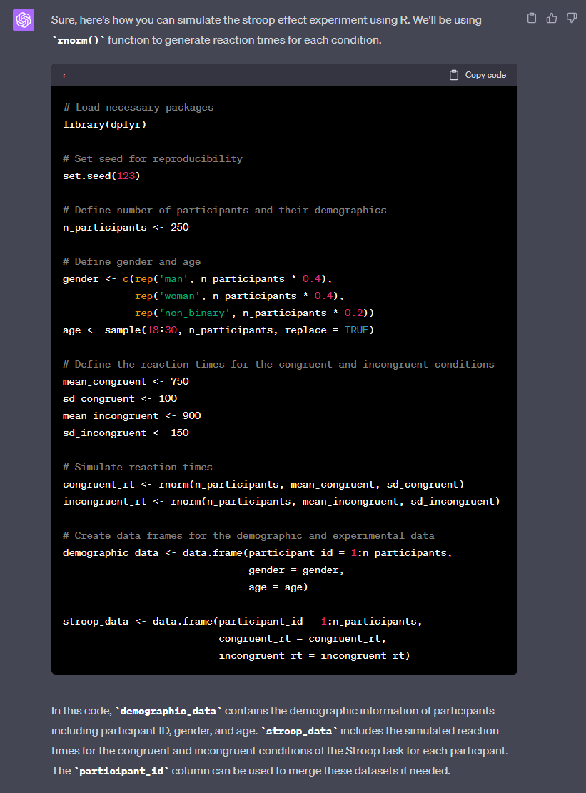 I’ve found that the accuracy of the questions and explanations it provides has been pretty good - although I say this aware of the context that this is an intro psych course in which I am asking it to generate fairly concrete factual questions. The big win for me is that I can generate a lot of questions with explanations and feedback in a short amount of time and I think that the rewrite of my data skills book has more practice testing in it as a result. With that said, regardless of whether it’s a theoretical or coding question and regardless of how good it’s been overall, I wouldn’t use anything ChatGPT produces for which I can’t verify the accuracy. When I ask it to write questions or write an explanation, I use the “regenerate response” option frequently so I can pick the best option and as with the simulation code, I’ve rarely been able to take what it gives me without a little bit of editing and a back-and-forth.