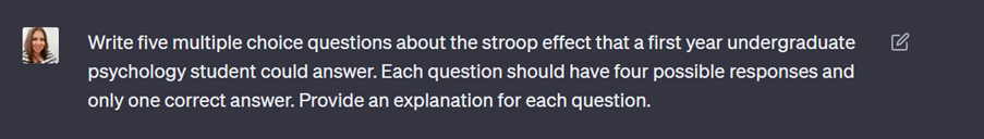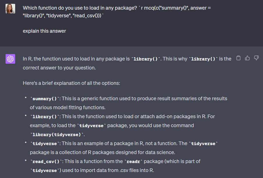 These questions are also being used as part of a formative exercise and I’d be reticent use it to generate questions for the summative MCQ exam that assesses the lecture content because I need to be 100% certain the questions are assessing what they’ve been taught. Generating plausible incorrect responses for questions I’ve written is a different matter though, I haven’t done it yet but I think there’s a use case for this. They’re often difficult to get right (let’s be honest, we’ve all written an MCQ where one option is just clearly total nonsense) and I think ChatGPT could help with providing possible options (which you then verify the accuracy of).