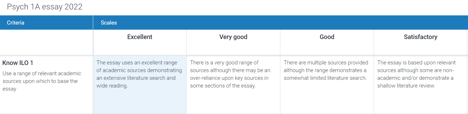 Quality and breadth of research sources | Extensively uses a wide range of high-quality, current, and relevant sources. Demonstrates a superior understanding of the field. | Uses a good range of high-quality, current, and relevant sources. Demonstrates a strong understanding of the field. | Uses a reasonable range of high-quality sources, but may lack some currency or relevance. Demonstrates a good understanding of the field. | Uses a limited range of sources, which may lack quality, currency, or relevance. Demonstrates a satisfactory understanding of the field. | Uses a small range of sources, which lack quality, currency, or relevance. Demonstrates a weak understanding of the field. | Uses very few sources, which lack quality, currency, or relevance. Demonstrates a poor understanding of the field. | Uses almost no sources, or uses sources that are largely irrelevant, outdated, or of low quality. Demonstrates a very poor understanding of the field. |
