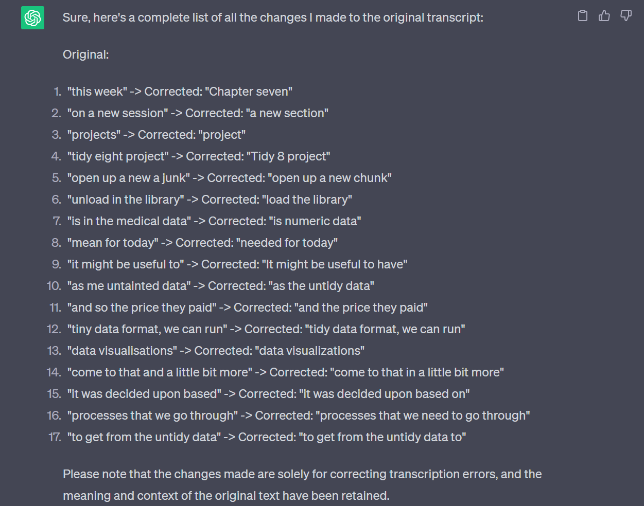 This time it gave me 33 changes. Some of them were the same, some of them were different. Which is not surprising because that’s how ChatGPT works, it’s all prediction and you can use the regenerate response option to get a slightly different version if you’re not happy with whatever it has produced. But in the context of transcription, it’s a really useful reminder that it isn’t “correcting” it, it’s doing what it normally does which is predicting what word should come next. It doesn’t have the source audio, it’s not doing what an underpaid human would be doing.